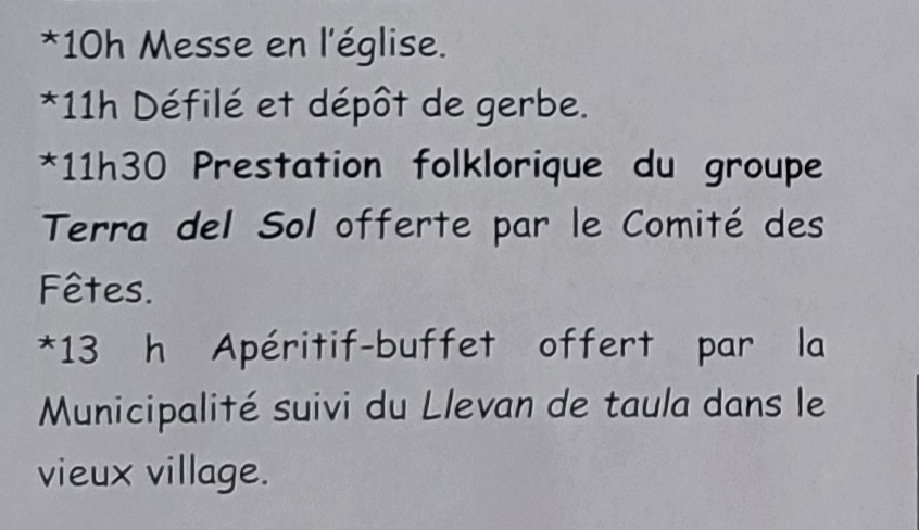 Nous remercions de leur présence M. Sol, sénateur des Pyrénées-Orientales, Mme Péral, conseillère départementale, M. Jorda, président de l’association des maires des Pyrénées-Orientales, le colonel Bail représentant l’Ordre National du Mérite, Mesdames et Messieurs les élus des villages voisins ainsi que les présidents des diverses associations. Merci aussi aux gendarmes, aux sapeurs pompiers, à la fanfare et aux porte-drapeaux pour leur participation.